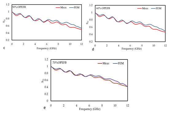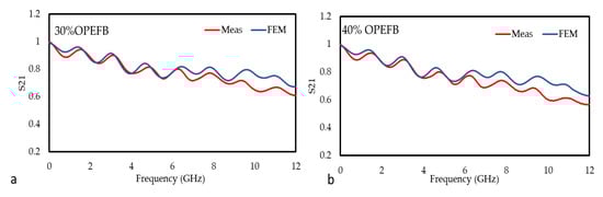 The graphs in Figure 15 and Figure 16 are the comparison between the measured and simulated (FEM) values of the S11 and S21 for the OPEFB/PLA composites, respectively. In general, there is a good agreement between the measured and simulated for all the composites. Table 2 shows the mean relative error of S11 and S21 and it can be observed that the lowest mean relative error of the S11 value for OPEFB/PLA composites is at 50 wt% OPEFB, while the highest value is at 30 wt% OPEFB. The lowest mean relative error of S21 value is at 70 wt% OPEFB, while the highest value is at 40 wt% OPEFB. The magnitude of S21 decreased with increasing OPEFB filler content, where the 70 wt% OPEFB percentage filler sample was found to have the lowest S21. These results are in agreement with the impedance mismatch theory where materials with the highest permittivity show lower transmission coefficient values []. Therefore, the magnitudes of S21 at 12 GHz are (0.610, 568, 0.499, 0.463, and 0.415) dB for (30, 40, 50, 60, and 70) wt% OPEFB, respectively.