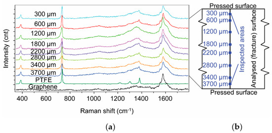 The Raman spectra of PTFE/graphene-4 can be seen in Figure 1a. The graphene-filled sample was fractured after cooling down with liquid nitrogen. The size of the analysed area in one measurement point is 50 µm × 50 µm.