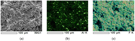 The dispersion of BA80-filler in PTFE/BA80-4 was also analysed by EDS, and it is presented in Figure 4. Figure 4a–c displays the cryo-fractured surface and the aluminium and fluorine content, respectively. The average size of the filler agglomerates was below 1 µm. The presence of an aluminium peak (Al-K, where K represents the K electron shell) was significant in the EDS spectra (Figure 3b). The total percentage of aluminium was 2.73%, 2.17%, 2.53%, and 2.09% at the four locations, which indicates efficient dispersion of the fine filler powder.