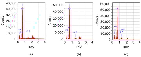 EDS spectra of PTFE/Al2O3-4 (a), PTFE/BA80-4 (b) and PTFE/MG70-4 (c) samples. The unmarked peak (~2.1–2.2 keV) is related to the sputtered gold (Au) on the sample surfaces.