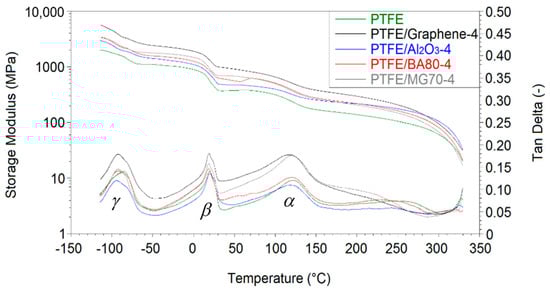 In agreement with the literature [14], all filled PTFE samples had markedly higher storage moduli with respect to the reference unfilled PTFE. Graphene, Al2O3, BA80 and MG70 improved the storage modulus at 20 °C by ~138%, ~33%, ~54%, and ~67%, respectively (Table 3). One possible reason for this improvement can be the restriction of the molecular chain motion due to the filler particles. Three main steps in the storage modulus curve and three main peaks on the loss factor (tangent delta) curve can be observed in Figure 6. The three significant peaks of tangent delta can be found at −95–85 °C, 18–20 °C and 117–121 °C temperature, depending on the given material (Figure 6 and Table 3). This is in agreement with the literature [20]. The temperature peaks correspond to phase transitions of PTFE: The first peak is the γ-transition, the second one is the β-transition while the third one is the α-transition [20]. Significant difference in the α/β-transition peak temperature in the function of the applied filler was not found.