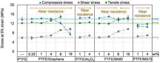 Compressive, shear and tensile stress of unfilled and filled PTFE samples at 5% strain. The blue, grey and green transparent lines display the compressive, shear and tensile stress of neat PTFE, respectively.