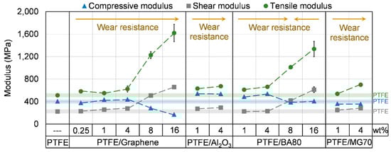 The wear rate as a function of the shear and compressive modulus is depicted in Figure 10. It can be seen that no clear relation exists between the compressive/shear modulus and the wear rate. PTFE/Al2O3-4 material had the lowest wear rate, with a low shear modulus and high compressive modulus compared to the other PTFE-based materials. In contrast with this, PTFE/graphene–16 had the second lowest wear rate, but it has the highest shear modulus and the lowest compressive modulus. The low wear rate of PTFE/Al2O3-4 material can neither come from its thermal conductivity, hardness or tensile modulus, as these properties only slightly changed compared to neat PTFE. It means that focusing on the wear rate, the dominating factor can only be the type of the applied fillers (e.g., filler material, particle size and geometry) and in this way the transfer layer formation. The applied filler and, consequently, the transfer layer formation can have a dominating (primary) role in the wear mechanism of the investigated materials.