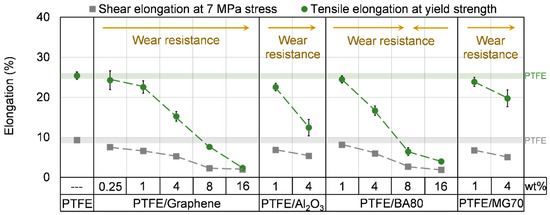 Shear and tensile elongation of unfilled and filled PTFE samples. The grey and green transparent lines display the shear and tensile elongation of neat PTFE, respectively.