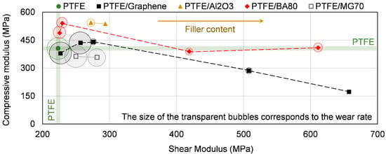 Compressive modulus as a function of the shear modulus of unfilled and filled PTFE samples. The size of the bubbles correlates to the wear rate of the samples.