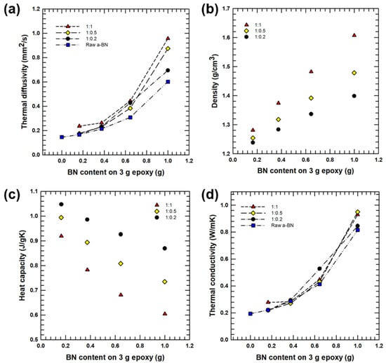 (a) Thermal diffusivity, (d) thermal conductivity of the composites with raw a-BN, and various ratio of the hybrid fillers. (b) Density, and (c) specific heat of the composites with different ratios of the hybrid fillers.