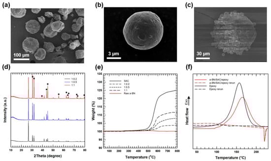 Figure 3a–c shows the FE-SEM images of a-BN particles, SAC305, and SAC305-attached a-BN hybrid filler. As depicted in Figure 3a,b, a-BN and SAC305 have spherical morphology with average particle sizes of 70 and 6 μm, respectively. Figure 3c shows the morphology of the a-BN/SAC305 hybrid filler with a 1:1 wt ratio. During the stirring and vacuum filtration process, SAC305 particles could be easily attached to the a-BN surface by van der Waals attraction force between metal and ceramic [23,24]. Figure 3d presents the XRD pattern of hybrid fillers with different wt ratios. The intensity of the peaks from SAC305 (marked with diamond symbol) increases with input ratio when normalized by the (002) peak of BN at an angle 2θ of 26.7°.Quantitative analysis was also conducted by measuring TGA in air, which is the curing process atmosphere used in this study (Figure 3e). There is no weight loss or gain for pristine a-BN, demonstrating thermal stability. For SAC305, the weight gain occurs near 400 °C, and the maximum weight is approximately 125% of its initial weight at 800 °C, corresponding to thermal oxidation [25]. For hybrid fillers, weight gain by thermal oxidation is increased with an increase in the ratio of SAC305; moreover, the weight gain percent at 800 °C of each sample corresponds well with the input ratio of SAC305.