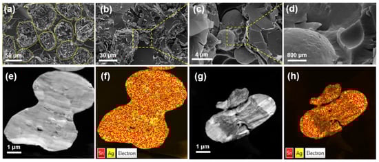 The coalescence behavior of SAC305 was further characterized by observing the fractured surface of the composites using FE-SEM and FE-TEM. Figure 4a illustrates the FE-SEM image of a-BN particles tightly packed inside the matrix. The interfacial phonon scattering between epoxy and a-BN impedes thermal conduction in the composites [27]. However, bridging fillers with SAC305 could solve this problem by constructing thermal transport paths to reduce thermal resistance. The bridging morphologies are depicted in magnified FE-SEM images (Figure 4b–d). Spherical SAC305 particles are coalesced to each other, and this was further confirmed by FE-TEM of the composites fractured surface. Figure 4e,g shows coalesced SAC305 particles; their EDS mapping images are shown in Figure 4f,h, respectively. No other visible image was detected except SAC305 in the composites, because of the strong signal from metal particles, compared to the ceramic filler and polymer matrix. These well-connected filler images also explain the decision of 10 min of curing time at 220 °C in this study. When we set the curing time at 220 °C for 30 min, too much melting occurred and flowed to the bottom of the composite, coalescing into huge particles when cooled (Figure S4).