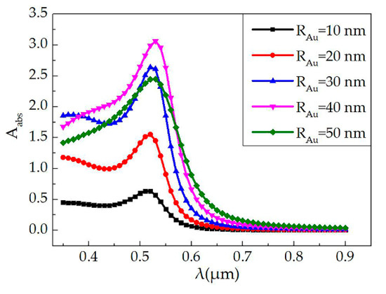 The absorption curves of the single Au NPs–polymer nanocomposite illuminated by pumping light were calculated by finite element analysis software. Figure 1 shows the absorption curves of the single Au NPs–polymer nanocomposite material when the wavelength changed from 350 to 900 nm, and the radius of the Au NPs increased from 10 to 50 nm. The curves exhibited a maximum absorption at a wavelength around 530 nm with the Au NPs radius of 40 nm. Due to the increase of the cross-sectional area, a larger radius will lead to a decrease for the absorption coefficient [32,33,34,35,36].