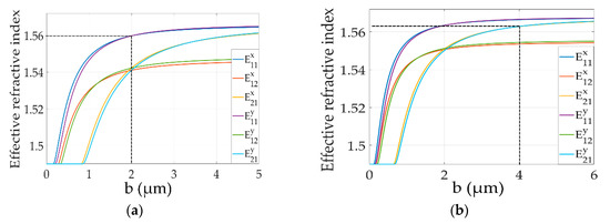 The mode in the waveguide is affected by the size of the core layer and the refractive index of materials using Matlab software (MathWorks.Inc., Natick, MA, USA). Figure 4 shows the curves of the mode characteristics of the all-optical switch in the non-modulated area with the thickness of the core from 0 to 5 μm. The calculated refractive index of the structure 1 at wavelength of 650 nm and the structure 2 at wavelength of 532 nm are shown in Figure 4a,b, respectively. The width of the waveguide core was set as 2 μm. The refractive index of core and cladding was 1.57 and 1.49, respectively.