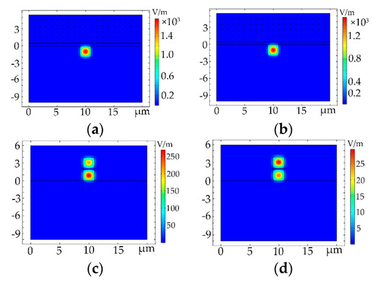 Light field distributions of the Au NPs-doped polymer all-optical switches for (a) E11 mode (structure 1); (b) E12 mode (structure 1); (c) E11 mode (structure 2) and (d) E12 mode (structure 2).