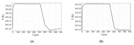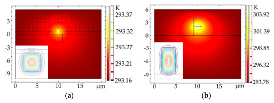 Temperature distributions of the (a) structure 1 (a = b = 2 μm; d = 0.5 μm; RAu = 40 nm) and (b) structure 2 ((a = 2 μm; b = 4 μm; RAu = 10 nm)) optical switches.