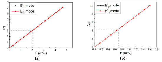 Figure 9 shows the curves of the relationship between the power consumption (p) and the phase change (Δφ = (2π/λ) × ΔN × L). N and L represent the effective refractive index change and the length of the modulation region, respectively. The phase change of the Ex11 mode and the Ey11 mode for structure 1 and the Ex12 mode and the Ey12 mode for structure 2 was linearity in the different incident light power consumption. The calculated power consumption was 2.05 mW and 0.5 mW for structure 1 and structure 2, respectively at π of phase shift. The results indicate that the optical switch of structure 2 had lower power consumption due to the higher heat produced by the Au NPs in the waveguide core layer.