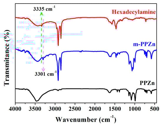 FTIR result of PPZn, m-PPZn, and hexadecylamine.