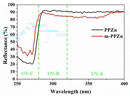 Figure 2 shows the UV-Vis reflectance spectra of the PPZn and m-PPZn. In the UV-A and UV-B regions, more than 80% of the UV light is reflected, indicating the barrier ability of the PPZn. A lower reflectance in the UV-C region is attributed to the absorption via the π→π* transition of the phenylphosphonate anion [27]. In the region of UV-A and UV-B, the organic modifier hexadecylamine was slightly reduced in the reflectance of the PPZn.