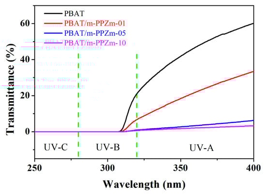 Figure 5 shows the UV-Vis transmittance spectra of the PBAT and the PBAT/m-PPZn composite materials between 250–400 cm−1. The UV-Vis results of the PBAT material show excellent UV-A penetration characteristics; however, they show poor UV-B and UV-C penetration characteristics due to the presence of the benzene ring and carbonyl group [36,37]. The UV-Vis results of the PBAT/m-PPZn composites show better UV barrier properties than that of the PBAT. Furthermore, the UV-A and UV-B penetration characteristics are reduced as the m-PPZn loading increases. Considering that m-PPZn has good UV-A and UV-B reflectance properties, the transmittance of the PBAT/m-PPZn composites decreases with increasing m-PPZn, indicating that the photon energy reflection by m-PPZn might be the main mechanism.