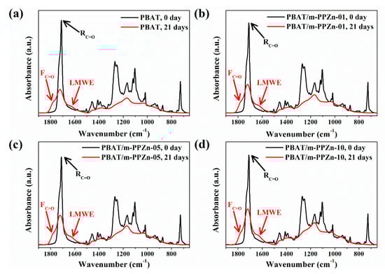 FTIR spectra of (a) PBAT, (b) PBAT/m-PPZn-01, (c) PBAT/m-PPZn-05, and (d) PBAT/m-PPZn-10 before and after 21 days UV irradiation.