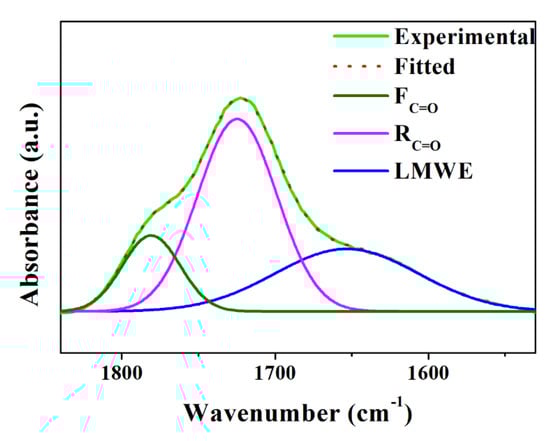 Similarly, the FTIR spectroscopy of the PBAT/m-PPZn composites was also carried out. The FTIR result shows the area of the corresponding deconvolution peak, which can be used to evaluate the ratio of related chemical groups [40,41]. In the deconvolution process of the FTIR spectra between 1850–1550 cm−1, the peak close to 1780 cm−1 was assigned to FC=O, the peak close to 1721 cm−1 was assigned to RC=O, and the peak close to 1646 cm−1 was assigned to LMWE. The ratio of the area under the peak assigned to the FC=O and RC=O group (FC=O/RC=O) was used to determine the evolution of photodegradation. A high value of FC=O/RC=O indicates more photodegradation in the PBAT. The FTIR deconvolution results of the PBAT after 21 days irradiation are shown in Figure 7, and the FC=O/RC=O ratio is presented in Table 1. The FC=O/RC=O ratio of the PBAT/m-PPZn composites is also shown in Table 1. The decrease in the FC=O/RC=O value with increasing m-PPZn content demonstrates that the m-PPZn retards the photodegradation of the PBAT.