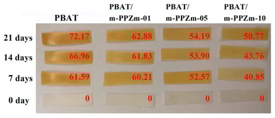 Figure 10 shows the average molecular weights (Mn) of the PBAT and PBAT/m-PPZn composites after UV irradiation. The result shows a remarkable molecular chain scission in the first week, which reduces as the m-PPZn content increases. After 21 days of irradiation, the PBAT/PPZn-10 retains the highest molecular weight, showing the best resistance to photodegradation. The result indicates that m-PPZn can play a significant role in photodegradation protection. In a study conducted by Chen et al., it was reported that the MMT layers could contribute to the UV reflection ability, resulting in less photon energy interacting with the PBAT [13]. A similar approach was adopted in this study through the effect of a similar two-dimensional layered m-PPZn in the PBAT-m-PPZn composite materials. A common problem associated with the outdoor application of polymers is the chain scission, which reduces their performance [10]. In agricultural applications, such as the use of mulch films, it is pertinent to consider the photodegradation of polymers by ultraviolet (UV) light. Thus, this study provides a suitable method of increasing the resistance of PBAT to photodegradation.