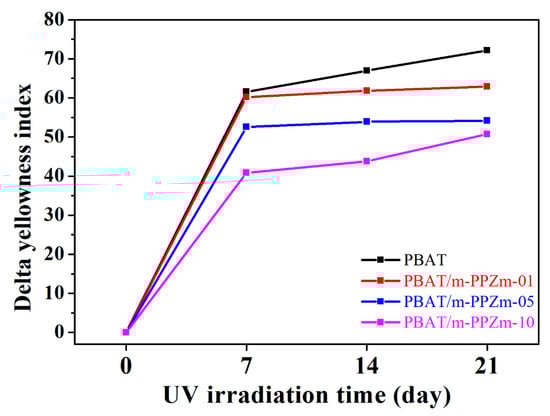 The appearance brought about by changes in color is another way to identify the differences in photodegradation. In Figure 8, PBAT and the PBAT/m-PPZn composites with different m-PPZn content show a clear discoloration after the UV irradiation. The samples changed to yellow after irradiation. Under irradiation, the exposed aromatic rings can be oxidized to phenoxy radicals, which cause the yellowing of the polymer due to their strong absorbance in the visible region. The yellowing phenomenon of the PBAT, which follows a similar mechanism, was reported [42,43,44]. The yellowing phenomenon is due to the oxidation of the benzene ring, and the dYI is used to determine the photodegradation of the PBA. The higher the dYI, the stronger the degradation. Figure 9 shows the dYI of the samples after UV irradiation. The dYI of each sample increases daily with the irradiation, which indicates the evolution of photodegradation. As the content of m-PPZn in the composite increases, the dYI of the sample decreases, which means that m-PPZn hinders the photodegradation of PBAT.
