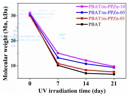 Average molecular weights (Mn) of PBAT and the PBAT/m-PPZn composites after 21 days of UV irradiation.