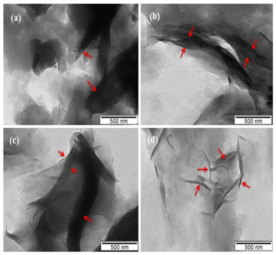 The transmission electron microscopy was used to determine the dispersion of Mag-CTA+ in Ros-Lim copolymer matrix and also to compare the results obtained by the XRD analysis. The TEM images of Mag-CTA+ and the obtained nanocomposites Ros-Lim/Mag-CTA+ (1, 5 and 10%) are shown in Figure 6. For Mag-CTA+, it is easy to define the silicate layers by the dark and bright lines. The nanocomposites (Ros-Lim/Mag-CTA+ 10 and 5%) show an intercalated structure of the modified clay. However, the nanocomposite (Ros-Lim/Mag-CTA+ 1%) shows a partial or total exfoliated structure, and the clay nanoparticles are mainly well dispersed in the Ros-Lim copolymer matrix. These results confirm the results obtained by XRD analysis.