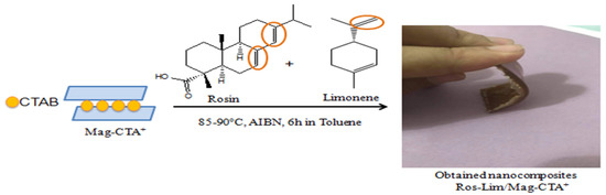 The use of organoclay (Mag-CTA+) has an impact on the morphology of the prepared nanocomposites, especially in the dispersion of in-situ polymerization methods. For these reasons, several nanocomposites based on polymers and organoclay were prepared [20,21,22,23,24]. By reviewing the literature, we found that no previously published work has described the use of natural clay as a nano-reinforcing filler in the preparation of green-nanocomposites based on rosin-limonene copolymer. In this study, after modification of clay by CTAB: cetyltrimethylammonuim bromide, we developed the synthesis of green nanocomposites Ros-Lim/Mag-CTA+ by in-situ polymerization method. In our study, a solution reaction was used in order to have uniform heating and also to avoid transfer reactions at a temperature between 85 and 90 °C using AIBN as a radical initiator. Our results were confirmed with different characterization methods such as Fourier Transform Infrared Spectroscopy (FTIR), X-ray diffraction analysis (XRD), scanning electronic microscopy (SEM), transmission electronic microscopy (TEM) and thermogravimetric analysis (TGA).