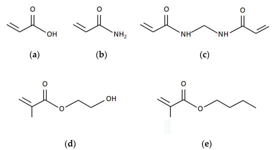 Chemical structure of the monomers and crosslinker: (a) Acrylic acid; (b) Acrylamide; (c) Methylene bisacrylamide; (d) 2-Hydroxy ethyl methacrylate; (e) Butyl methacrylate.