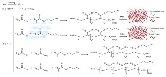 The composite hydrogels were prepared by copolymerization of acrylate comonomers onto starch. Potassium persulfate was used as a free radical initiator. The persulfate initiator is decomposed at 80 °C to generate sulfate anion radicals. The radicals remove hydrogen from the hydroxyl group of starch to form alkoxy radicals. The monomer molecules (AA, and HEMA or BMA) that surround the reaction sites become acceptors of starch radicals, resulting in chain initiation. Then, they become free radical donors to other molecules during the chain propagation. When the crosslinking agent MBA is present in the system, the end vinyl groups of MBA react with polymer chains, forming a three-dimensional crosslinking network. If AAm is present in the system (instead of MBA), the formed hydrogel is a copolymer without the chemically crosslinked structure. The mechanism of copolymerization is outlined in Figure 2 [14].