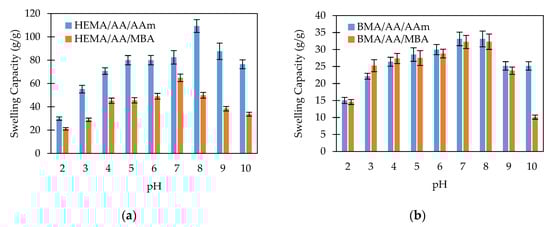 Swelling capacity of the hydrogels as a function of the pH. Effect of crosslinking: (a) Comparison of HEMA/AA/AAm and HEMA/AA/MBA hydrogels; (b) Comparison of BMA/AA/AAm and BMA/AA/MBA hydrogels.