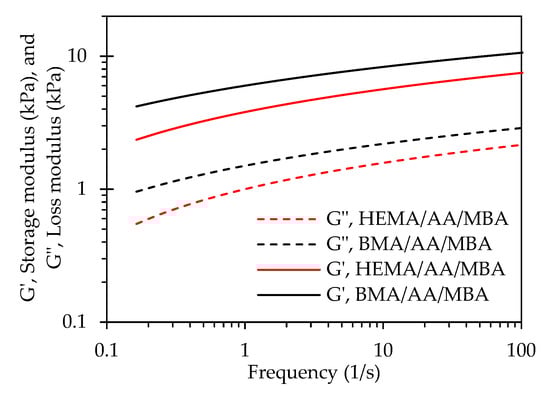 The rheological properties of the chemically crosslinked starch-based hydrogels are shown in Figure 5. The storage modulus is an indication of the ability of the hydrogel to store deformation energy in an elastic manner. As can be observed in Figure 5, the storage modulus (G′) of the BMA/AA/MBA gel is greater than for the HEMA/AA/MBA gel. The crosslinking density is defined as the number of chain segments between crosslinks per unit volume. The crosslinking density (Ve) of the hydrogels was calculated using the values of the storage modulus (G′) determined from the rheological measurements. According to the theory of rubber elasticity [37], the crosslinking density of the hydrogels is directly proportional to the storage modulus (G′). Equation (3) was used to calculate the crosslinking density of the chemically crosslinked hydrogels [38].