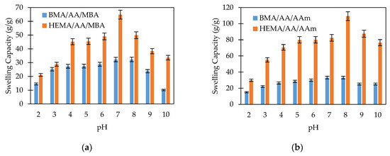 Swelling capacity of the hydrogels as a function of the pH. Effect of the hydrophilic/hydrophobic monomers: (a) Comparison of BMA/AA/MBA and HEMA/AA/MBA hydrogels; (b) Comparison of BMA/AA/AAm and HEMA/AA/AAm hydrogels.