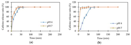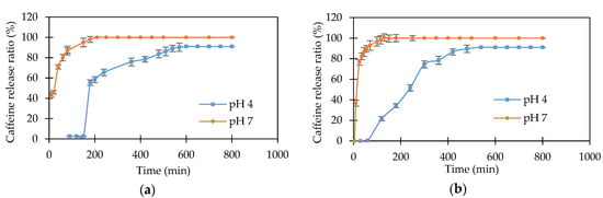The release profile of caffeine molecules from starch-based copolymer (HEMA/AA/AAm, HEMA/AA/MBA, BMA/AA/AAm, and BMA/AA/MBA) hydrogels into pH 4 and pH 7 buffer solutions can be observed in Figure 7 and Figure 8. In these figures, it is readily apparent that the caffeine molecule has a much faster release at pH 7 than at pH 4. Figure 7a,b shows that caffeine release starts immediately after the hydrogels are immersed into pH 7 buffer and that it is completely released after 210 min and 130 min for the HEMA/AA/AAm and HEMA/AA/MBA hydrogels, respectively. However, the same hydrogels show a delay of 150 min and 60 min before the caffeine starts to be released in pH 4 buffer. After 210 and 130 min, approximately 58% and 25% of the preloaded caffeine is released from the HEMA/AA/AAm and HEMA/AA/MBA hydrogels, respectively.