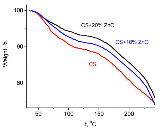 Another confirmation of strong interaction between side groups of CS with ZnO NPs can be obtained from TGA measurements (Figure 3). It was previously reported [47] that neat CS exhibits a two-step weight loss. From room temperature to ca. 150 °C, the weight loss is related to the water evaporation and in the temperature range of 170–300 °C, the weight loss is due to the degradation of the CS [47]. Water absorption in CS is closely linked to the availability of amino and hydroxyl groups of CS that interact via hydrogen bonding with water molecules [47,48]. It has been observed that the water content depends upon ZnO NPs concentration (Figure 3) and it decreases with increasing weight% of NPs (11.7% in neat CS and 7.3% in CS-ZnO film with 20 wt.% of NPs, at the temperature 140 °C). As it was shown by FTIR analysis, these groups can bond with ZnO NPs; therefore, a decrease in the water absorption ability with increasing ZnO concentration is observed.