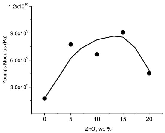Similarly, to the dielectric behavior, there is a maximum on the Young’s modulus as a function of ZnO concentration. Ref. [38] reports a maximum on the Young’s modulus in PHBV-ZnO (Poly(3-hydroxybutyrate-co-3-hydroxyvalerate-ZnO) at a composition of 4 wt.% of NPs; Ref. [39] reports that system PEEK-ZnO (poly(ether ether ketone)-ZnO) shows a maximum at 5 wt.% of ZnO; PMMA-ZnO at 1 wt.% of NPs [40]; PLA-ZnO at 2 wt.% [41]. In summary, such a maximum in Young’s modulus has been related to the distribution of nanoparticles within the polymer matrix and strong interfacial adhesion that can enhance the mechanical properties of nanocomposites [42].