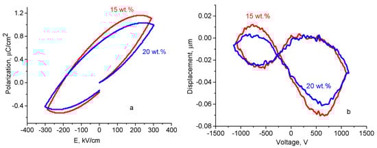Figure 6 shows the ferroelectric hysteresis curve obtained in the CS-ZnO NPs film with 15 and 20 wt.% of NPs. The shape of the curve is typical for samples with electrical leakage, which prevents reaching saturation in the polarization [49]. This leakage current can be associated with the intrinsic proton conductivity of the CS matrix [50]. The corresponding deformation curves do not present symmetrical shape, probably because of the interaction between ZnO NPs and CS. The piezoelectric coefficient d33 was evaluated in the linear region of the deformation curve vs. applied voltages using the expression d33 = Δl/ΔV [51,52]. The piezoelectric coefficient d33 in CS-ZnO nanocomposite films with 15 wt.% of NPs (d33 = 65.9 pC/N) is higher than in neat ZnO NPs (between 0.4 and 12.4 pC/N [53,54]) and in poly(vinylidene fluoride) PVDF-ZnO flexible films (13.42 pC/N [55], 18.3 pC/N [56], 50 pC/N [52]) and compared with PVDF-PTTE-ZnO nanorods (70.3 pC/N with 15 wt.% of nanorods [57]). Note, that PVDF is a polymer with piezoelectric properties.