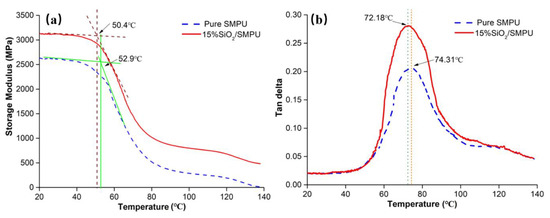 Using the SiO2/SMPU sample as an example, when the temperature range was between 20.0 and 50.4 °C, the SiO2/SMPU sample was in a glassy state. The storage modulus was high, with a gradual slowing downward trend, becoming more and more stable. The reason for this phenomenon is that both soft and hard segments in SiO2/SMPU are in a glassy crystalline state when the SiO2/SMPU sample is in a glassy state.