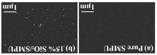 As shown in Figure 3a,b, the microstructure of the pure SMPU and Karlsruhe SiO2/SMPU samples were tested. For the SiO2/SMPU composites, SiO2 agglomerates with an average size of about 70–180 nm were clearly observed. Due to the single particle size being just around 16 nm, it can be found that SiO2 dispersed in the SMPU matrix consisted of several primary particles, which revealed that SiO2 is homogenously dispersed in SMPU and further proves the results of the DMA test.