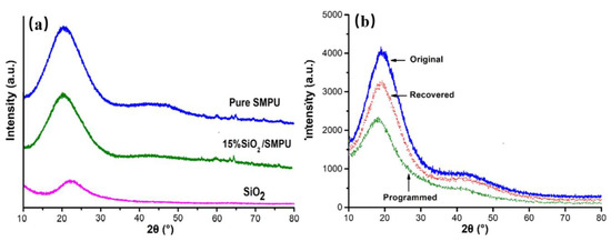 (a) XRD patterns of SiO2, Pure SMPU, and 15% SiO2/SMPU composites, (b) XRD patterns of different states of the 15% SiO2/SMPU composite.