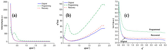 (a) SAXS intensity curves, (b) corresponding Lorentz correction curves, and (c) SAXS profiles of scattering curves of original, programmed, and recovered SiO2/SMPU samples.