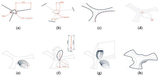 - Based on the endpoints of these edges and one corner of the polygon, a three-point arc-curve was constructed. The normal and tangent vectors of this curve were extracted (Figure 6c).