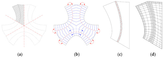The fiber layout for the TFP was based on the two-dimensional outline curves. The pattern was only designed for one part of the symmetrical layout (Figure 7a). First, the surface edges were defined as a rigid edge, a hinged edge, or an open edge (Figure 7b). According to the biological role-model, a hinge zone is defined along the curved crease (Figure 7c). The layout was generated following the logic of programmed anisotropy, which is illustrated in this section. The area was divided into quads (Figure 7d) and every quad contains two diagonal lines (Figure 7e). The aspect ratio and size of the quads determined the direction and strength of the reinforcement, as well as the stiffness of the structure. For the generation of the quad cell dimensions, multiple requirements were taken into account, as shown in Figure 7d: