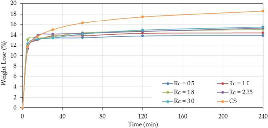 Over Rc = 1, the behavior of complexes is similar for the different ratios increasing progressively with the time and chitosan content indicating a larger crosslinkage degree due to H-bonds and probably amide bond formation involving free –NH2.