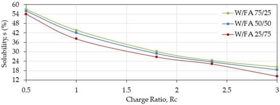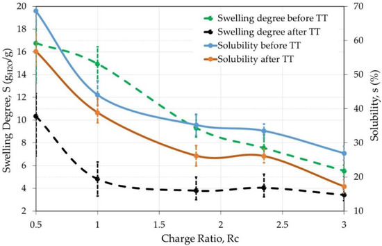 Influence of Charge Ratio Rc and pH on Swelling Degree and Solubility (%) before and after Thermal Treatment for Solubilization in W/FA 50/50.