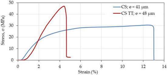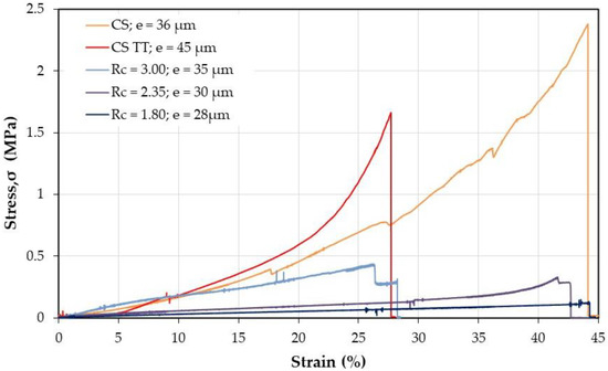 Effect of thermal treatment (TT) on mechanical chitosan film response in the dried state. The thickness (e) of the film samples was found around 40–50 μm.