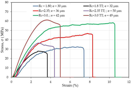 Effect of thermal treatment (TT) on mechanical response of PEC films in the dried state. Stress as a function of strain (%) before and after thermal treatment for different complexes characterized by Rc.