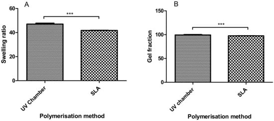Comparison between (A) the swelling characteristics and (B) the equilibrium water content of the UV chamber-polymerised polyethyleneglycol dimethacrylate (PEGDMA) hydrogels and the stereolithography (SLA)-polymerised PEGDMA hydrogel.