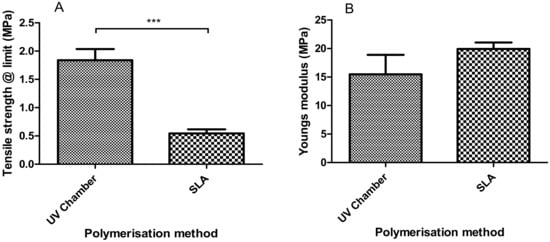Dynamic mechanical analysis results showing (A) the tensile strength at limit and (B) Young’s modulus of the UV chamber-polymerised PEGDMA hydrogels and the SLA-polymerised PEGDMA hydrogels.