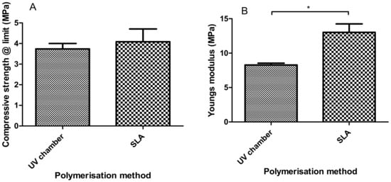 Similarly to what was seen with tensile Young’s modulus measurements in Section 3.3, the compressive Young’s modulus values shown in Figure 5 had SLA hydrogels with increased stiffness values when compared to the UV chamber samples; with Young’s modulus values of 13.01 MPa and 8.26 MPa, respectively. Moreover, the compressive strength values of 3.73 MPa for the UV chamber samples and 4.08 MPa for the SLA samples were also observed with no significant differences showcasing the comparability of the overall strength of the PEGDMA samples.