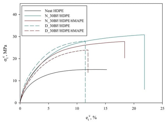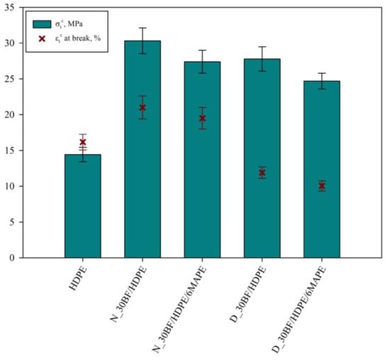 On the other hand, when degreased BF was incorporated into the HDPE, tensile strength at break was enhanced in a 92.5%, achieving a value of 27.78 MPa. The obtained value was slightly lower than the one from the N_30BF/HDPE sample, making the degreasing process unjustifiable, even when 6 wt% of MAPE was added to the composite (see Figure 2). Experiments with degreased BF show the typical behavior of fiber-reinforced thermoplastic composites, where mechanical performance is enhanced, while ductility and deformability are negatively affected [].
